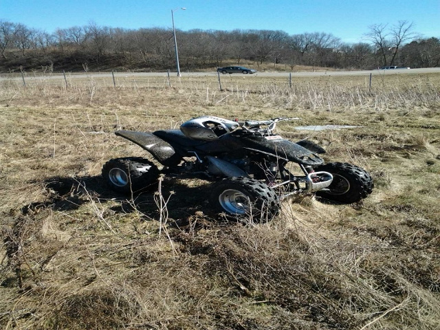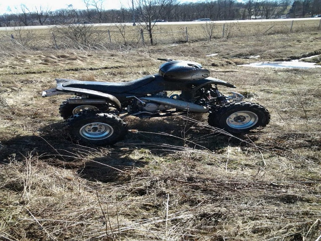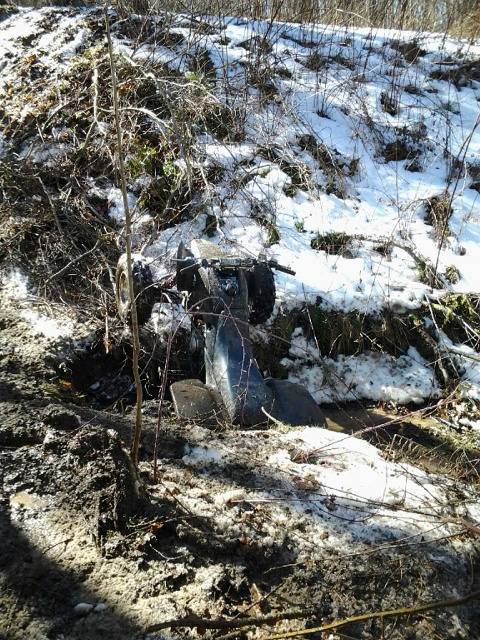 My wheeler after it rolled down the hill after I put gas in it on Friday. Nothing was wrecked on it hitting the tree....just kind of funny. I was like wtf? Where did it go? Rolled about 50 yards down my driveway.