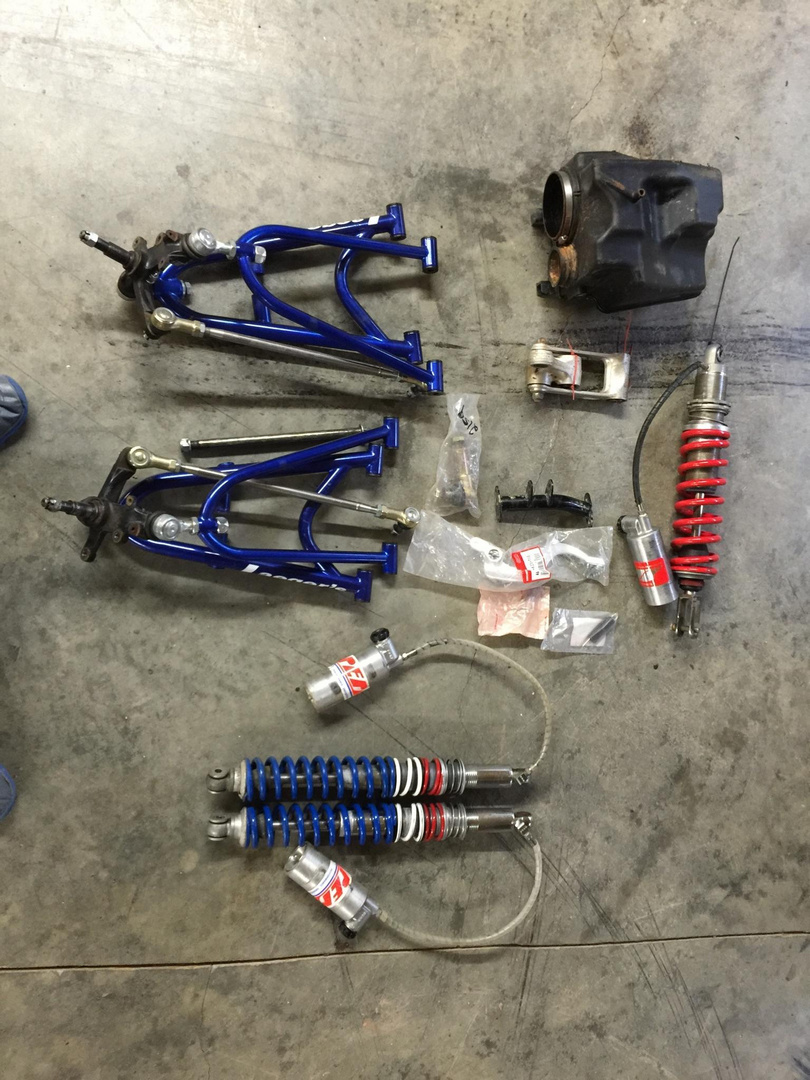 No PC or paint yet, just freshly sandblasted. Going with black on frame, subframe, swingarm, stem, not sure about a-arms. I'm going to see how they match up with the graphics kit. Not BRAND new frame but pretty close. Thanks for the compliments so far. A lot more to come. Started polishing the nerfs, bumper, grab bar and shrouds tonight.