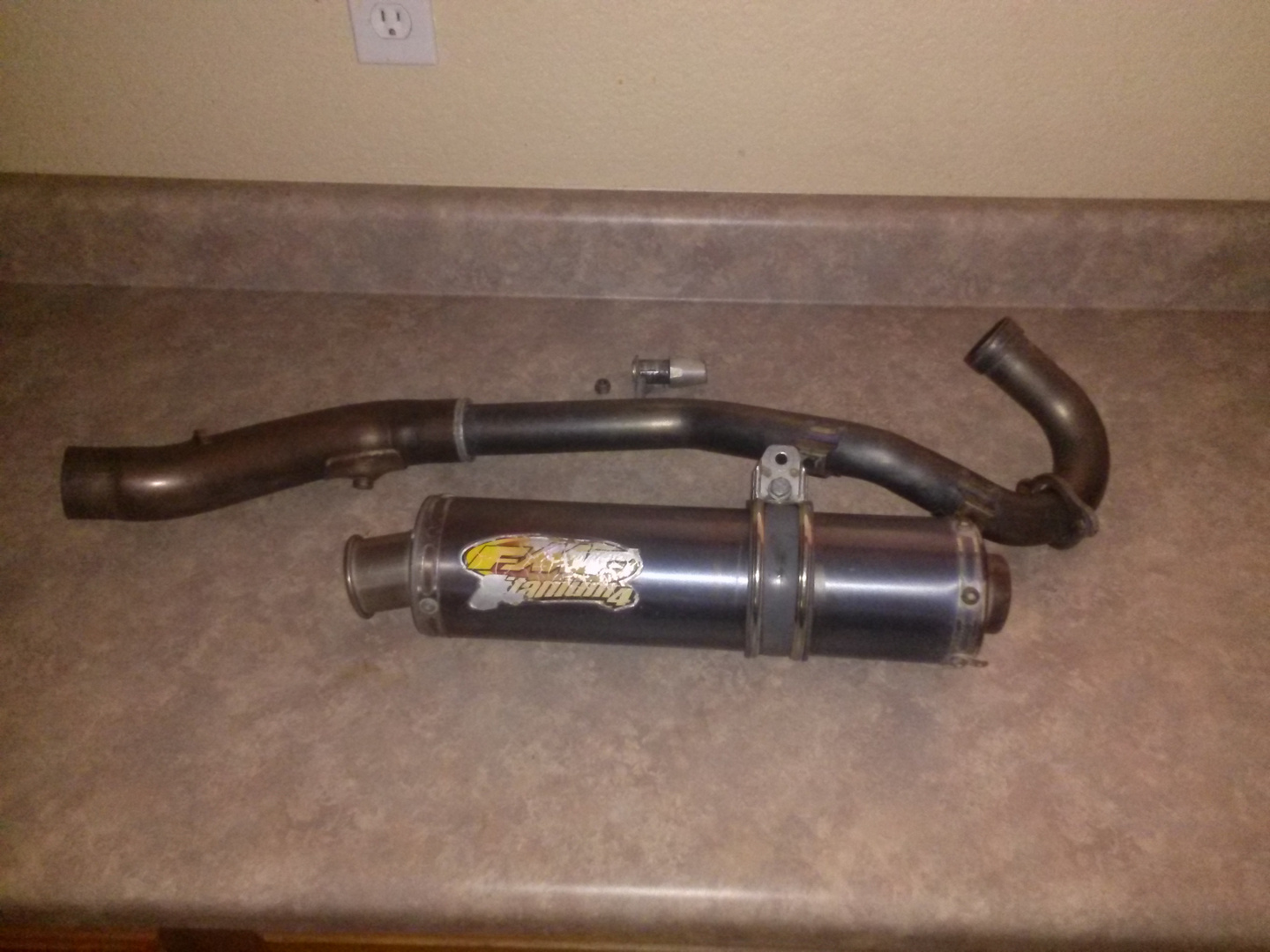 I have a complete crf450 hybrid exhaust for sale. The exhaust is in great shape. Full titanium header, stainless mid pipe, and titanium silencer. This exhaust was on a 2002 Honda crf motor in a 400ex frame. Very nice. Needs repacked. Comes with everything in pics. $175 shipped . Please call or text Mark 602 800-2677