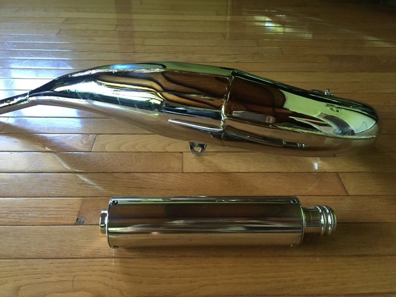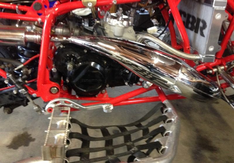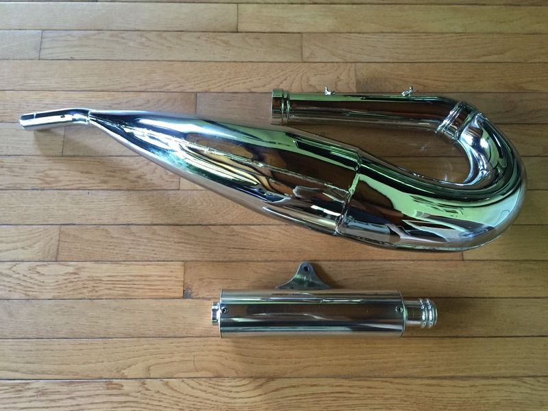 ESR Triple Chrome Plated TRX7 Center Mount pipe and silencer. When I bought this pipe I requested that he didn't rivet a ESR plate to the pipe. I also had the cheap Nickel plating from ESR removed and had the pipe triple chrome plated. This is in amazing used condition. It is a great low to midrange pipe great for MX or Woods. It also has the older style silencer that is much better looking in my opinion. The silencer is polished as well. The pics off the bike were taken today, the pics mounted are older. $349.