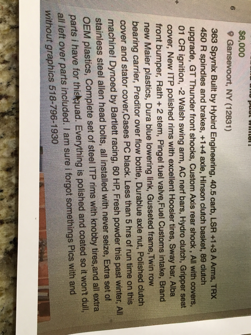 Really nice flat track quad/MX asking $6000 with all extra parts or $5000 without parts 518 796 1930 text or call, have a dyno sheet to go with it. Total rebuild this past winter, best of everything