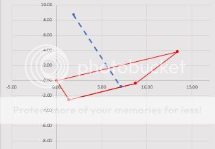 Dashed blue line represents the shock, the red lines represent the swingarm, dogbone, and linkage. This is at the 10" of compression you'll see the dogbone and link are nearly in a straight line so that is causing out problems.