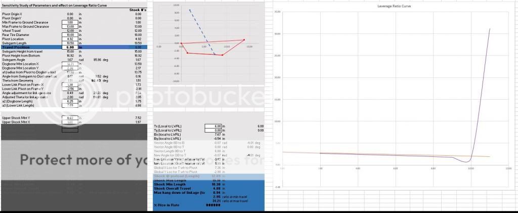 Also I blew up a portion of the spreadsheet to look at shock lengths, etc...  Also the max hang down of the linkage if that is negative means at bottoming out or full compression the linkage hangs below the bottom of the frame, also not good.