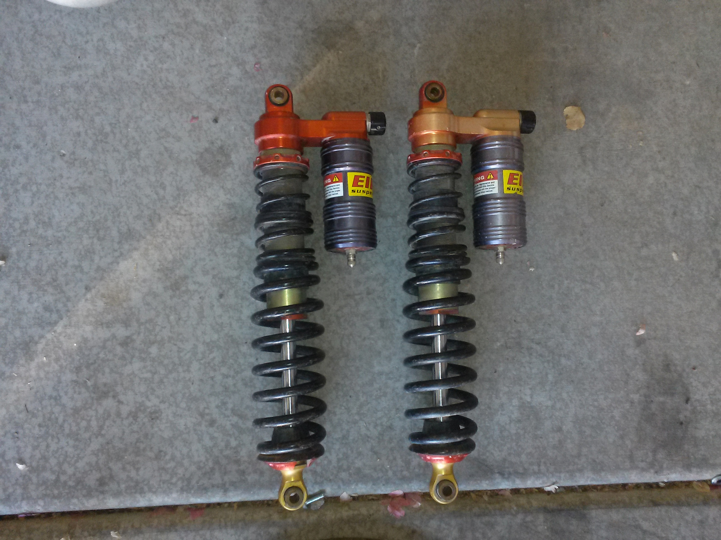 I have a set of elka standard travel front shocks for sale. They are in good working order, the Anodizing is a little faded. Shocks are triple rate, compression and pre load aadjustable. 16.5 inches long from center to center.