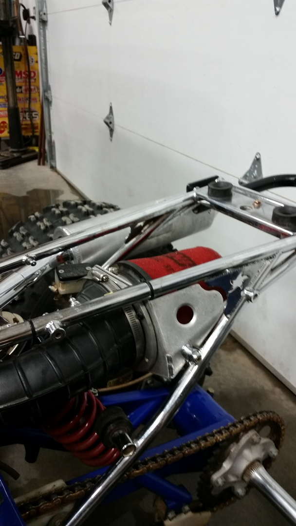 If you look at page 4 of my thread over on ATV Riders, I have a couple pics of the intake. The Pro Tect airbox is designed to use the oem boot, it comes with a piece of metal tubing and hose so you can get to the carb. The only difference between then and now is I had to move the box back a couple of inches, so the piece of tubing is a bit longer. I had to move it back because if I didn't the shock would have rubbed on the boot. Of course, moving it back meant I was going to have issues with the caliper and swingarm hitting the airbox. As I said, it works, but not really happy with it. One of these days I plan on having a fab shop build me a custom setup, but that will probably be a while down the road.
