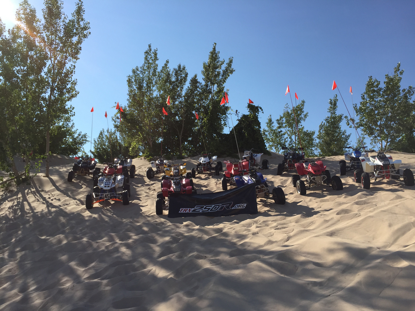 bummed I didn't get to ride with ya all and missed the group pic. We set up base camp out on the flats by the beach, too hot and dusty in the parking lot. Plus the event on Sat. for the disabled veterans was were the only shallow spot was to get across the gigantic puddle and they wouldn't let anyone through. Since I don't run an airbox lid on my R I ended up having to pull out my Predator so I wouldn't suck in water. got some pics on Friday.