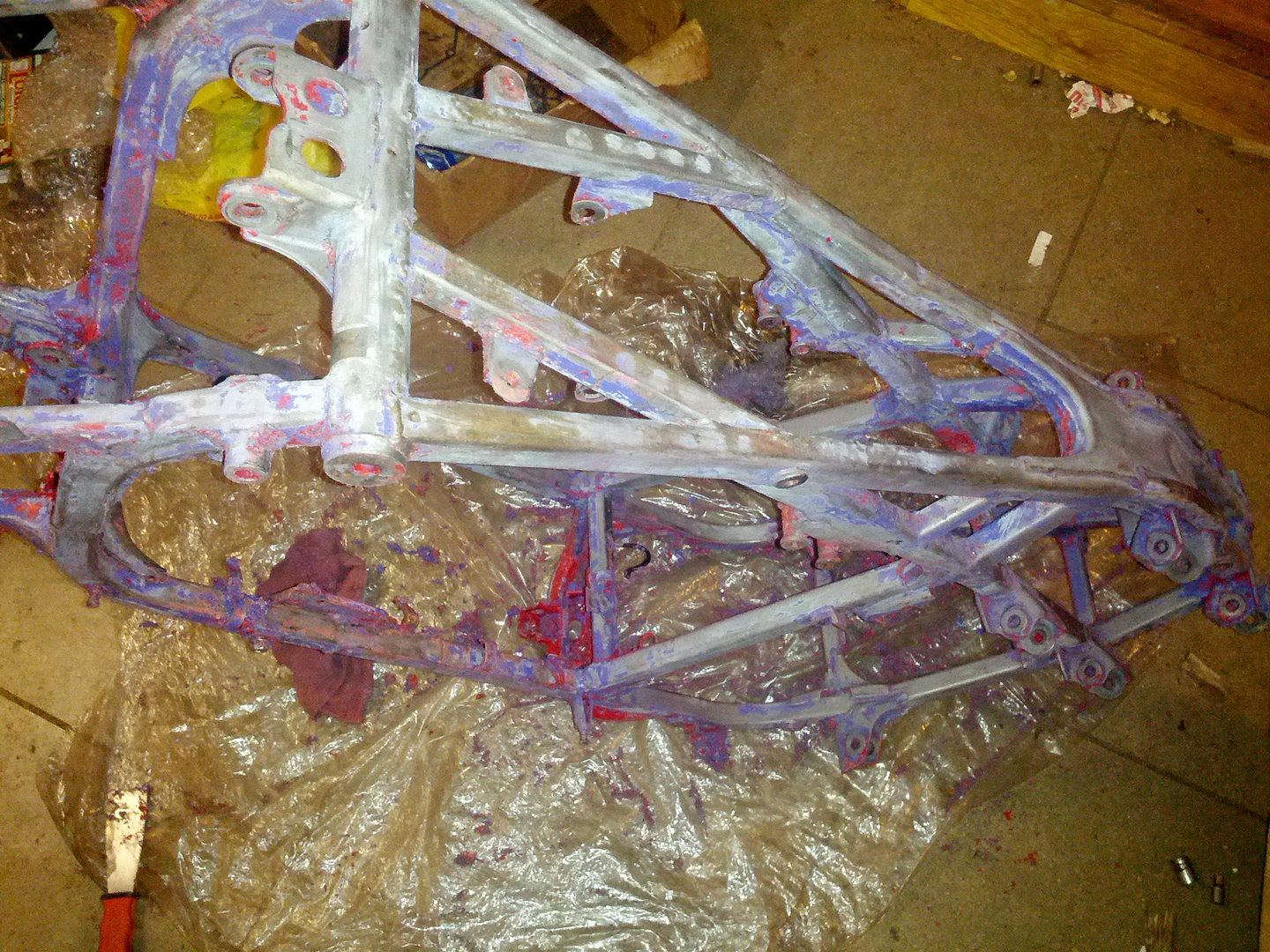 Been stripping paint here and there for about a week and finally getting somewhere.   Doing all this work to fix a crack, install gusset kit and powder coat frame.