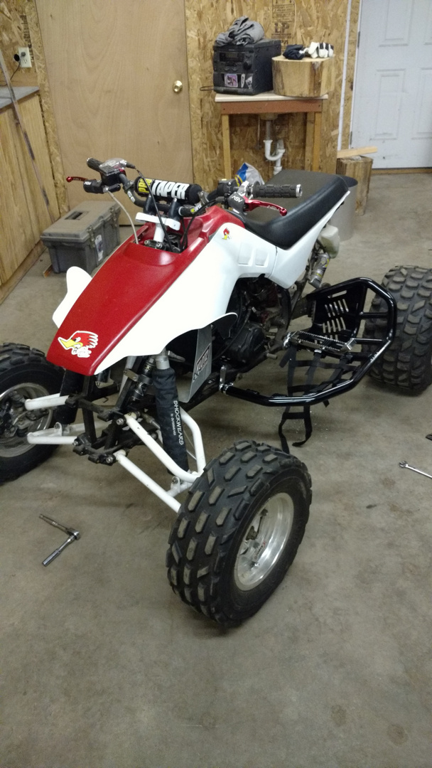 Here's a pic of my project R. 86 frame. Threw a clean 85atc motor in it. Put 450r A arms and swingarm on it. Gunna get some white rear fenders. Needs grab bar and bumper yet. Want to set this quad up to bang on the trails,hills,and sand pits. Sold all my yfzs for old school!